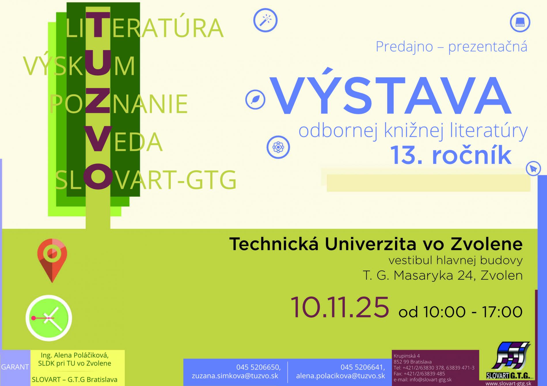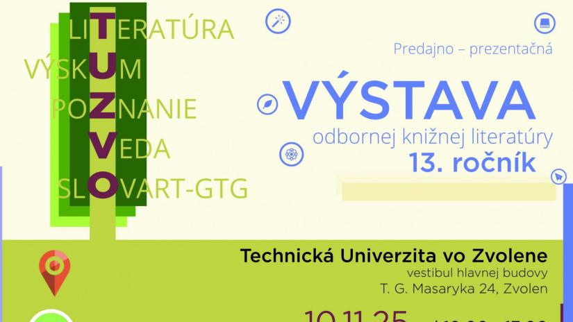 Dňa 10.11.2025 od 10.00 - 17.00 hod. sa vo vestibule hlavnej budovy TUZVO, T. G. Masaryka 24, Zvolen, uskutoční 13. ročník predajno-prezentačnej výstavy zahraničnej odbornej knižnej literatúry SLOVART, na ktorú Vás srdečne pozývame.